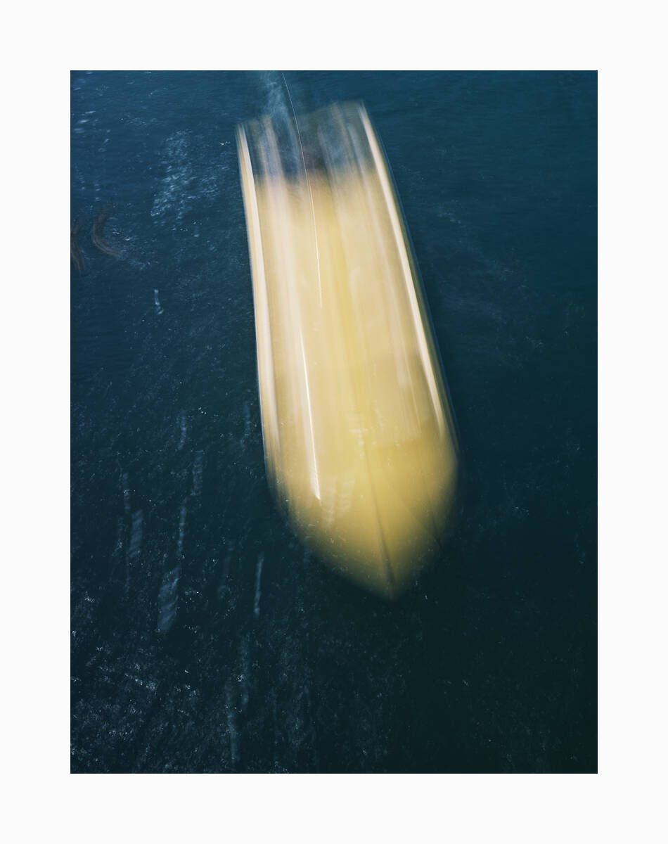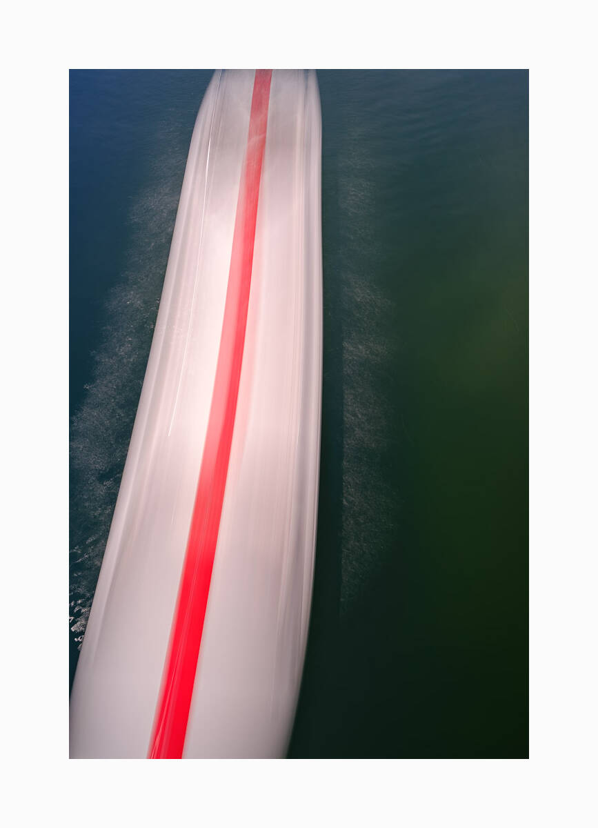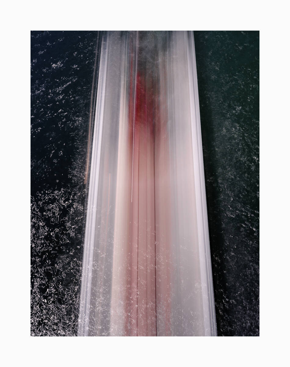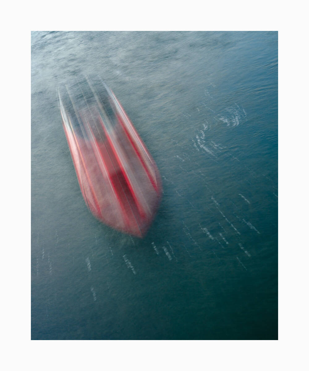 In his series trace, Peter Dušek captures the ephemeral poetry of motion across water, presenting abstract aerial photographs of streaks and wakes left by boats as they traverse serene expanses in the lakes of Ontario, Canada’s Muskoka region. Viewed from overhead, these fluid trails become dynamic compositions of line and form, evoking the transient marks of human presence on the natural world—yet people themselves remain unseen, their absence within the streaks underscoring the occupants’ invisibility. Interwoven occasionally are subtle traces of Dušek’s own Water Music series—patterns of circles, organic loops and lines seen on the surface, blending intentional artistry with the organic choreography of the water, wind and sun. The vibrant hues of the boats emerge as vivid counterpoints, punctuating the predominant blues and greens of the water they glide upon, creating a harmonious yet contrasting visual symphony that explores themes of movement, the ephemeral, time passing, and the interplay between structure and fluidity.