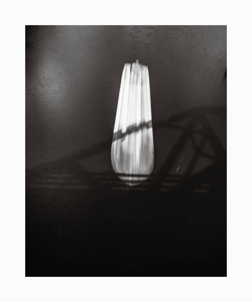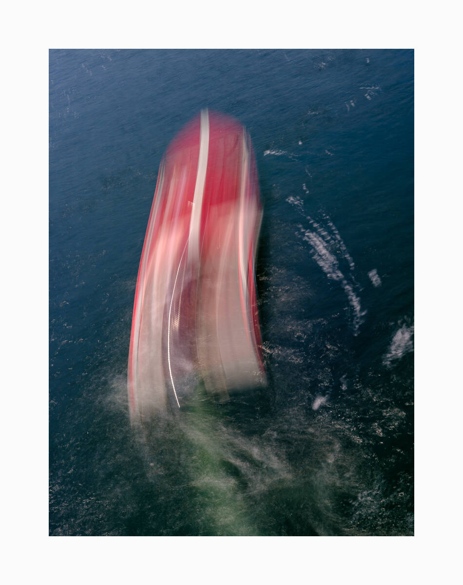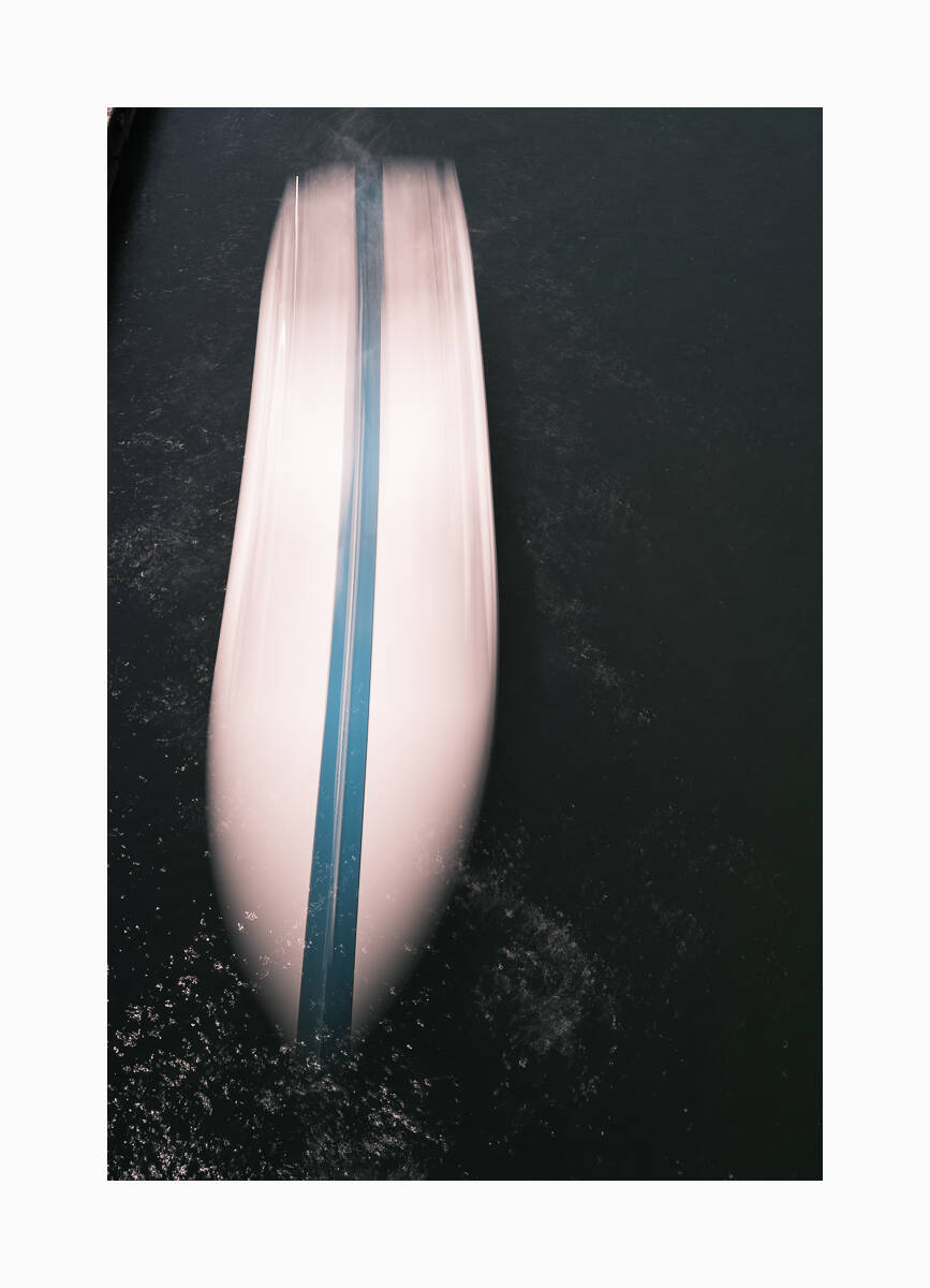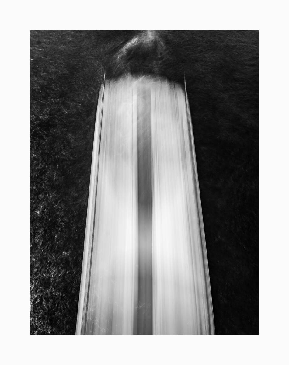 In his series trace, Peter Dušek captures the ephemeral poetry of motion across water, presenting abstract aerial photographs of streaks and wakes left by boats as they traverse serene expanses in the lakes of Ontario, Canada’s Muskoka region. Viewed from overhead, these fluid trails become dynamic compositions of line and form, evoking the transient marks of human presence on the natural world—yet people themselves remain unseen, their absence within the streaks underscoring the occupants’ invisibility. Interwoven occasionally are subtle traces of Dušek’s own Water Music series—patterns of circles, organic loops and lines seen on the surface, blending intentional artistry with the organic choreography of the water, wind and sun. The vibrant hues of the boats emerge as vivid counterpoints, punctuating the predominant blues and greens of the water they glide upon, creating a harmonious yet contrasting visual symphony that explores themes of movement, the ephemeral, time passing, and the interplay between structure and fluidity.